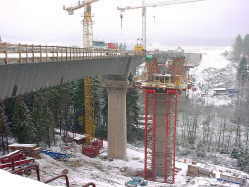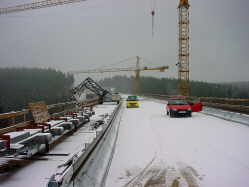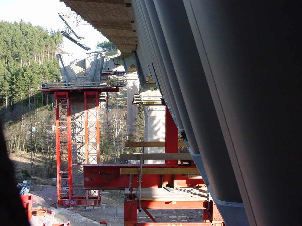 Geschichte. Die unten erkennbare, spektakuläre Aktion des Ein-Pfeiler-Balancierens war erfolgreich. Inzwischen hat der Brückenkörper seine Fahrbahnplatte und ist provisorisch bereits befahrbahr. Blick gen Südosten.